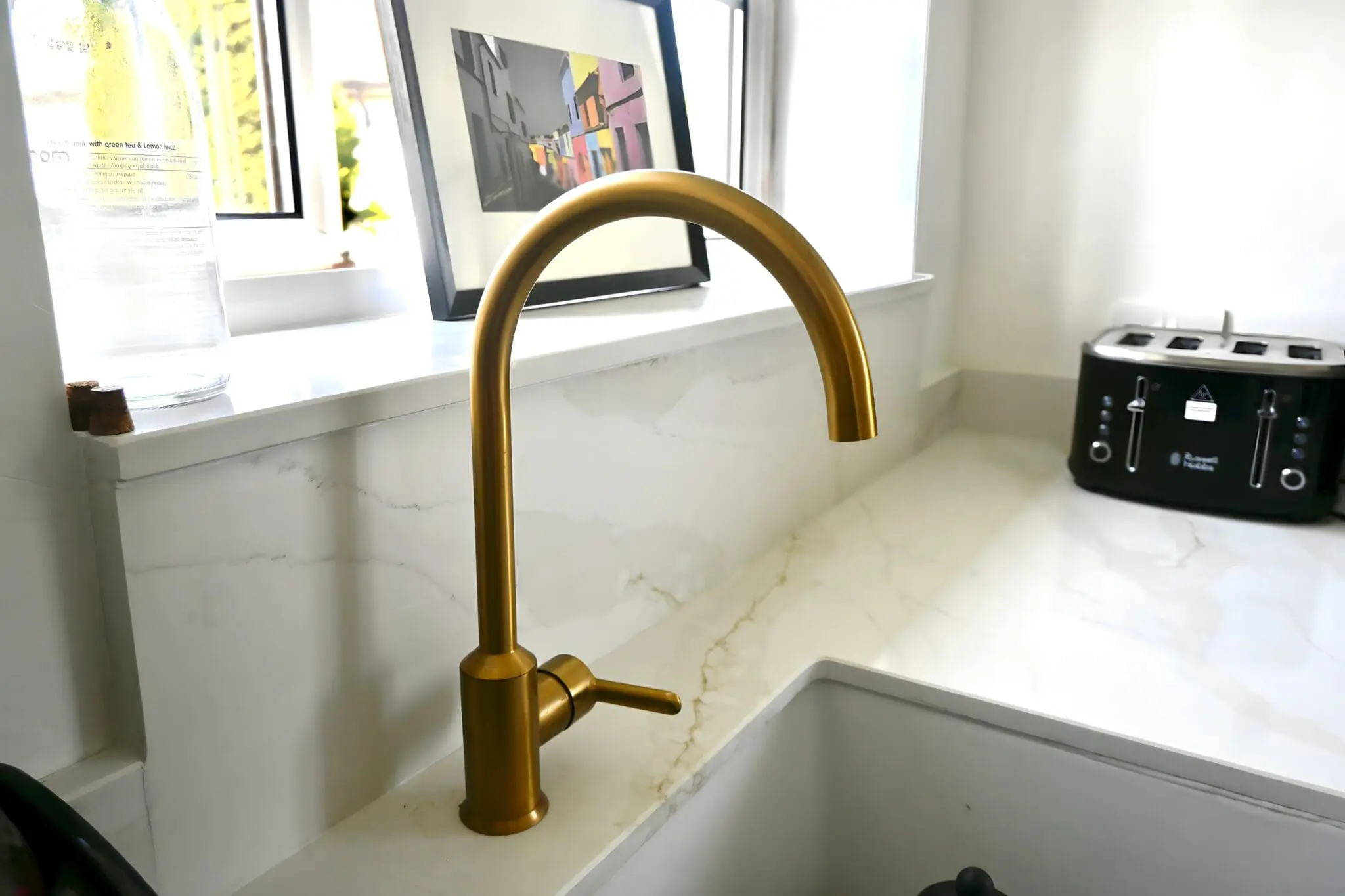 The Enzo Quartz worktops don’t just enhance the visual appeal of the kitchen they create a space where Damien can truly enjoy the everyday moments, whether it’s sharing a meal with friends or simply taking time to relax in a beautiful, functional setting.
