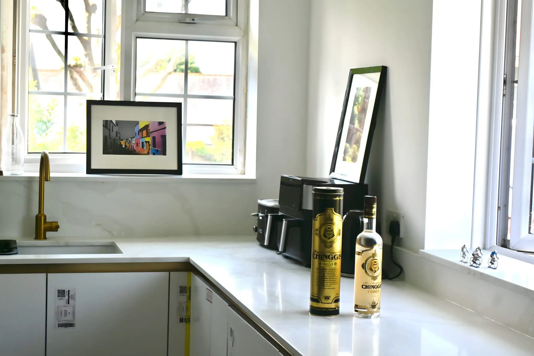 The result is a kitchen that not only meets Damien’s practical needs but also creates an environment where he can unwind and entertain with ease. Every detail of the space was thoughtfully designed, and the Enzo Quartz worktops serve as the heart of the kitchen, blending style and functionality seamlessly. These worktops offer more than just a surface—they provide a refined, sleek focal point that elevates the overall design of the room. The smooth, polished finish of Enzo Quartz complements the modern aesthetic, making the kitchen feel sophisticated yet inviting.