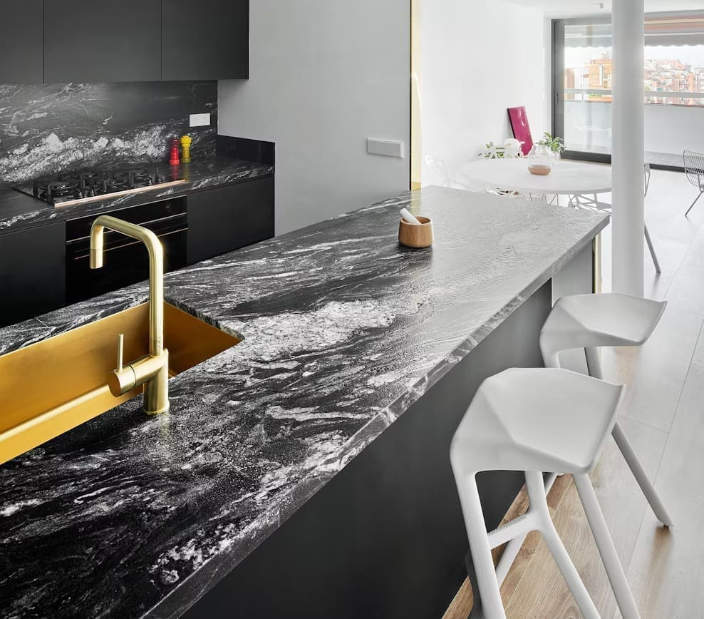 Here comes the real Black Beauty of the exclusive Sensa Granite Collection. As its name shows, this is one of the stunning and gorgeous stones. It is a deep, consistent black with a captivating natural pattern. You will find intricate silver, grey, and sometimes subtle gold flecks, alongside sweeping white veins that can resemble the foam of ocean waves. This striking mix gives it a dynamic and luxurious feel, perfect for both modern and classic homes that you will see all over the UK. Each slab is unique, a true work of natural art from Brazil or India.